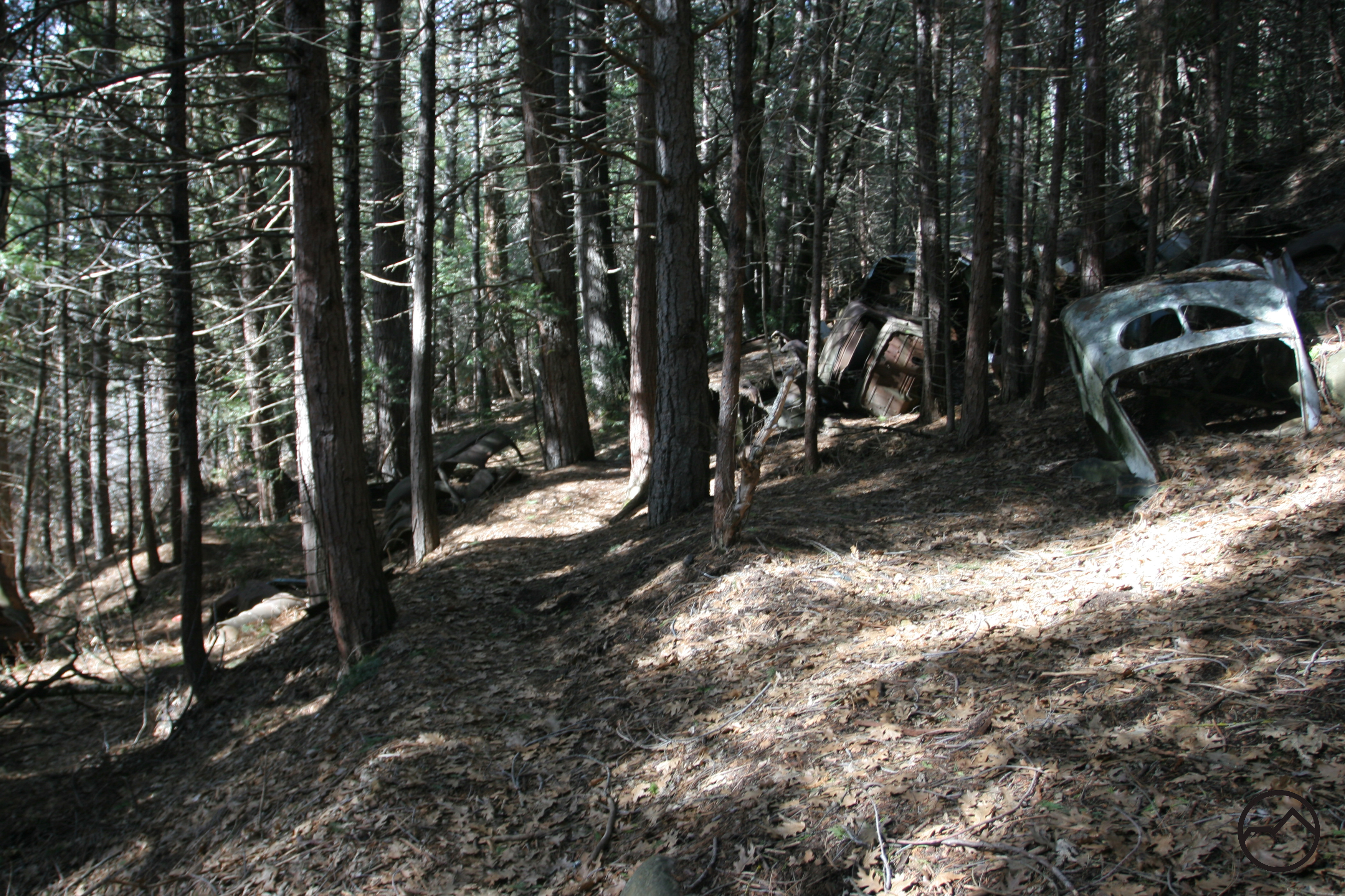 Beyond the stone embankment and the golf course, the trail narrows considerably and becomes a normal, singletrack trail. It soon passes a small, spring-fed creek. The creek has an attractive, narrow gorge of its own as it drops down toward the Sacramento. Beyond the creek, the trail maintains an easterly course along the Box Canyon rim. Soon one might notice a few rusty barrels. These are followed by a couple of old, rusty cars, in states of deep decay. This is just a harbinger of the extensive auto-appliance graveyard ahead. The graveyard seems to have been the place when the earlier residents of Mount Shasta City would push their unwanted cars and appliances down the hill to dispose of them. At the time, the slope must have been clear of trees. Now it is heavily wooded and would have been impossible to position the objects were they are currently placed. Some even have trees growing through them. The auto-appliance graveyard is much more extensive than appears from the trail. There are some use trails that wind their way through the extensive collection of antiques. This makes an interesting excursion all its own. Rather than seeming like trash or litter along the trail, the graveyard adds an interesting angle to the Box Canyon Trail and seems more like a piece of history than an old dump.