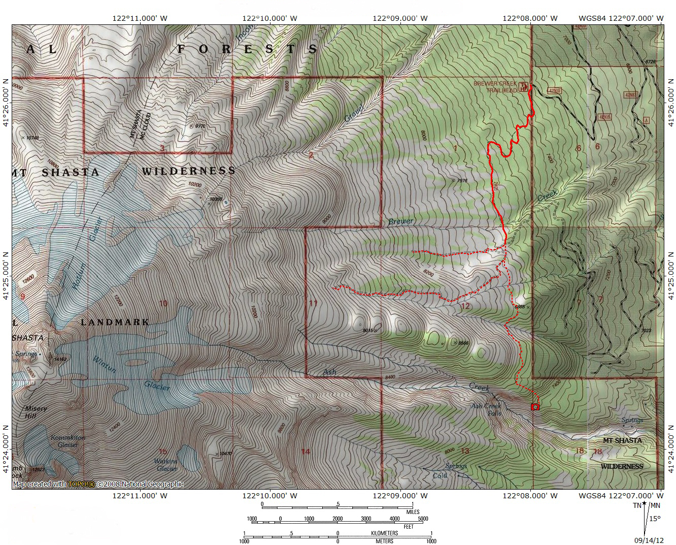 The east side of Mount Shasta is the lonely side of the great mountain. No communities gaze upward at its glaciated verges and no paved roads access its slopes.This should not be taken as a discouragement, for the east side of Mount Shasta is perhaps its most majestic side. Cloaked in the massive sheets of the Hotlum and Wintun Glaciers, this is the wildest side of an extremely wild mountain. Indicative of the forsaken nature of the east side, one lone trail, the Brewer Creek Trail, provides access to the upper reaches of California’s monumental volcano. In this case, lone most definitely does not mean lame. The Brewer Creek Trail is an absolutely stunning path with epic views of Mount Shasta and two of its largest glaciers, the Hotlum (California’s largest) and the Wintun (California’s third largest). The trail accesses routes ascending both the Hotlum and Wintun Glaciers. These are premier routes up the mountain. The Brewer Creek Trail is also the initial portion of the route climbing the Hotlum-Wintun Ridge. This route passes the Hotoon (combination of Hotlum and Wyntoon, a local variant of Wintun) Snowfield, a non-glacial but permanent body of snow high on Mount Shasta. For those not intent on and ascent of Mount Shasta, the Brewer Creek Trail still provides fantastic hiking opportunities. In addition to fantastic views and the chance to explore the delicate, alpine riparian world of Brewer Creek, the trail provides access to Ash Creek Falls, Mount Shasta’s most sublime waterfall. The vista of the falls with Mount Shasta and the Wintun Glacier looming high overhead is purported to have been John Muir’s favorite view of the volcano.