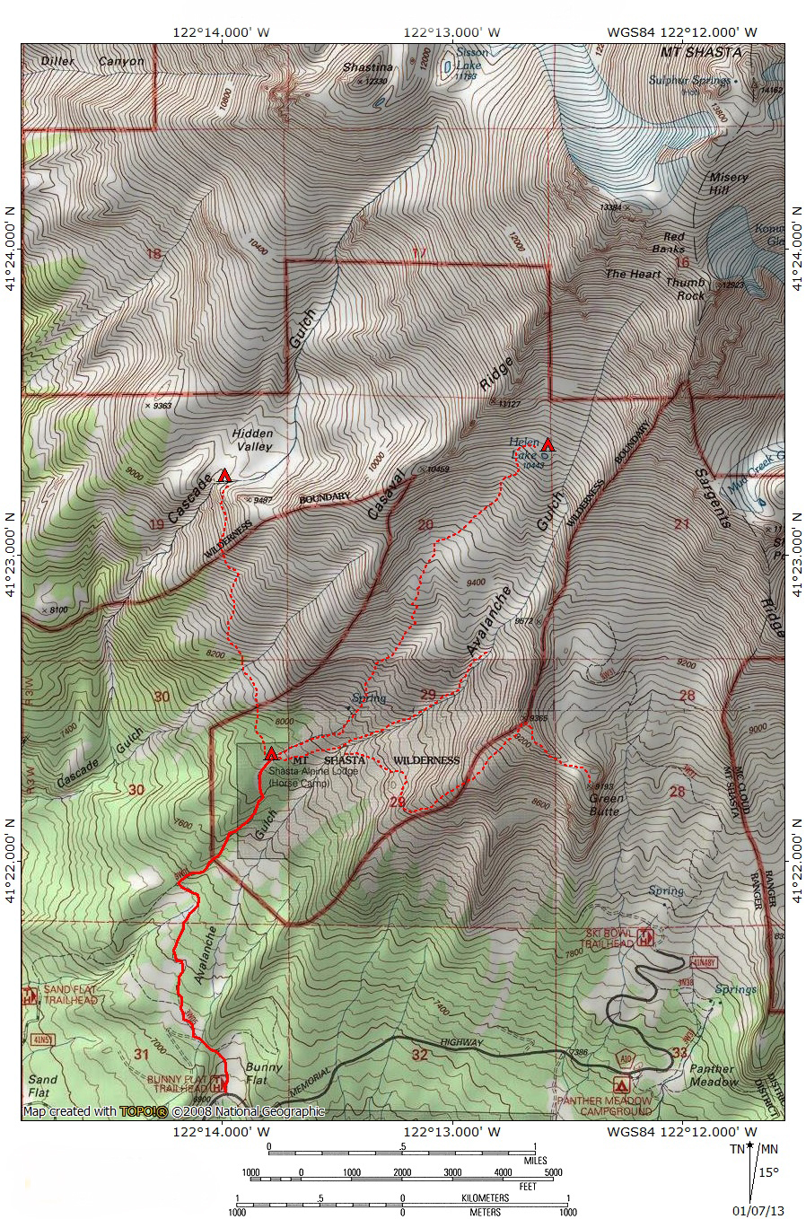 The four primary destinations of the Horse Camp Trail are Hidden Valley, Helen Lake, a hidden spring in Avalanche Gulch and Green Butte. Of these four routes, all but the hidden spring have routes leading to the summit of Mount Shasta. The most popular route to the summit departs Horse Camp and climbs up Avalanche Gulch to Helen Lake. From there it heads to the top of the mountain. Several routes begin at Hidden Valley and climb to the summits of both Mount Shasta and Shastina. The route that leads to Green Butte also extends onward, up Green Butte Ridge and to the peak. The hidden spring-fed creek in Avalanche Gulch is the least known of these destinations but is an attractive destination. Horse Camp itself is a beautiful spot. The old Sierra Club cabin, called the Shasta Alpine Lodge, sits in the middle of a small meadow with Mount Shasta and the upper section of Avalanche Gulch looming high above. The cabin was originally envisioned as the first of a series of cabins en route to the summit.