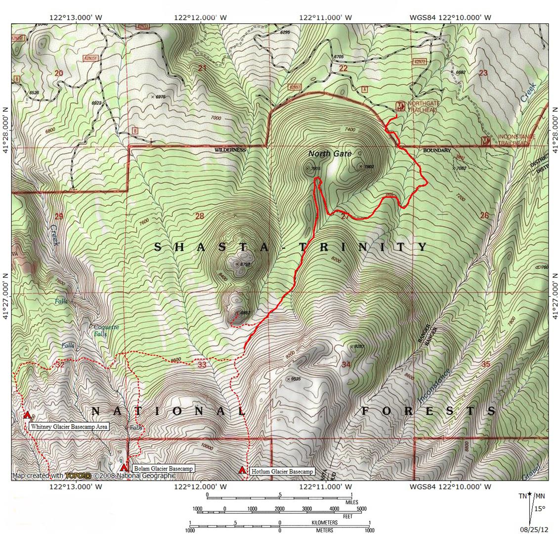The North Gate Trail accesses Mount Shasta’s north side. The trail takes its name from a series of volcanic plugs that the trail traverses and passes beneath. While the path is used primarily to gain access to the routes that climb the volcano’s northern slopes, it is also a good option for those who wish to just hike on the flanks of the great mountain. Generally, the routes accessed via the North Gate Trail include the Whitney Glacier, the Whitney- Bolam Ridge, the Bolam Glacier, and Hotlum-Bolam Ridge routes. (It should be noted that one can access the Whitney routes via the Whitney Falls Trail, but this route has been wiped out be repeated glacial outbursts and is no longer maintained. In addition, it involves more elevation gain than the North Gate Trail.) There are no routes west of the Whitney Glacier (until one reaches the south side of Shastina, an area accessed from the south side of Mount Shasta). The routes to the summit beyond the Hotlum-Bolam Ridge are accessed via the Brewer Creek Trail. Consequently, any north side attempt at Mount Shasta’s summit is reached via the North Gate Trail, which means that this can be a heavily used path at times. For those out for a simple hike, the trail is a great opportunity to experience Mount Shasta’s northern perspective, as well as take in vistas of a hefty slice of the northernmost part of the state. Although the official trail does fade away as one climbs in elevation, those looking for a concrete destination can either climb North Gate Plug 8,852 or attempt a bushwhack to Bolam Creek’s canyon in search of elusive Coquette Falls.
