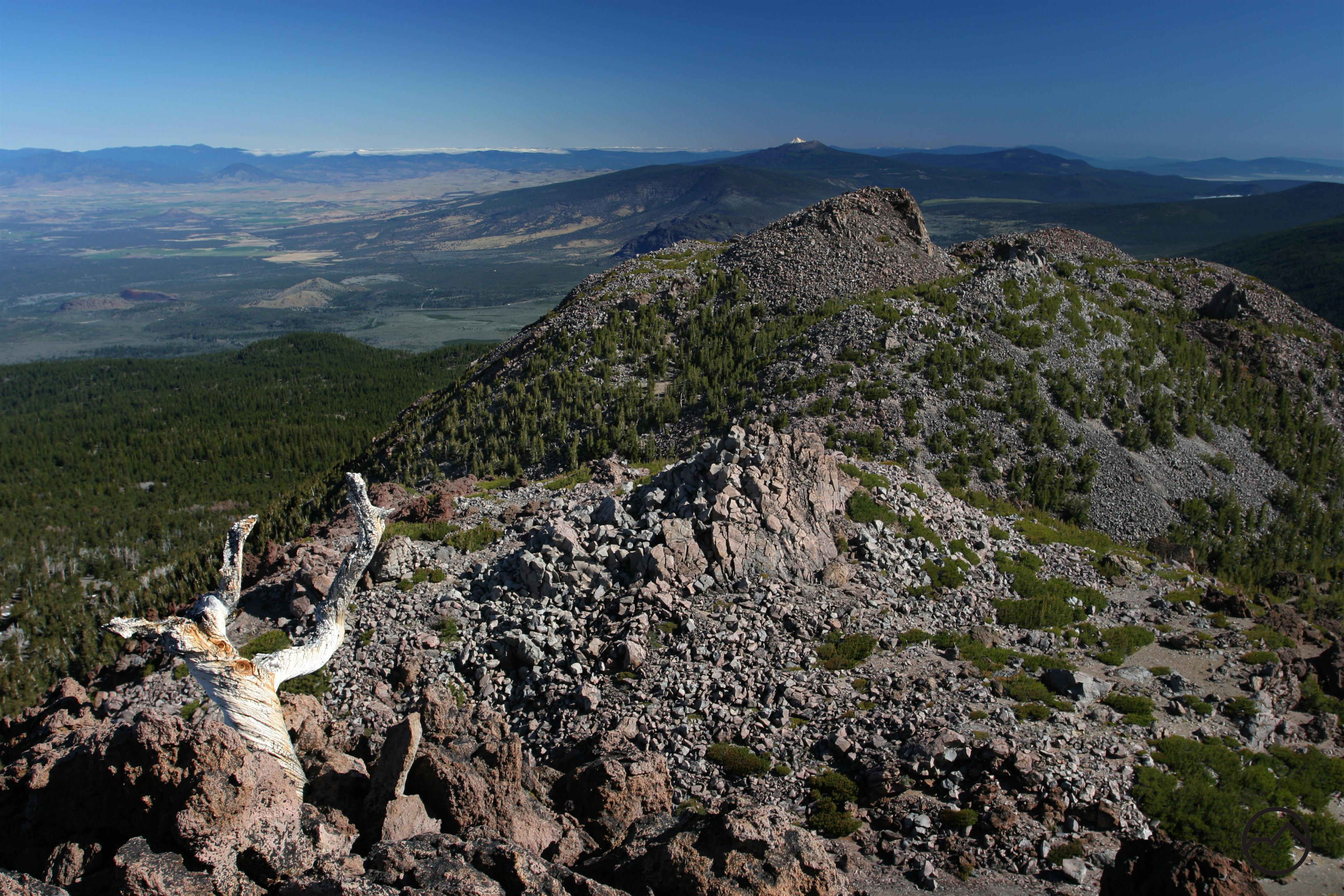 If one is simply hiking, rather than attempting to climb Mount Shasta, the summit of North Gate Plug 8,852 is a great destination. To climb the plug, continue west from the narrowest point of the North Gate, angling toward the base of the plug. There is a broad, talus-filled chute down the south face of the plug. While this looks like a quick way to the top, the talus is very loose, as much of it has not found its angle of repose. Rather than attempting this, continue west just a little further, to a makeshift campsite surrounded by white bark pines. Here there is a large rib of solid rock that leads up the plug. Climb up the large rocks on the left side of this rib. The rock along here is larger and more stable and the rib is solid and provides a sound base for climbing up to the summit. From the top, the northern Eddies, the Scott Mountains, the Russian Mountains, the Marble Mountains, the Red Buttes, Siskiyous and southern Oregon Cascades are all visible. Mount McLoughlin is finally visible for the first time, situated right above the Goosenest. Far below, Lake Shastina, the Haystack, Yellow Butte and Grass Lake can all be observed.