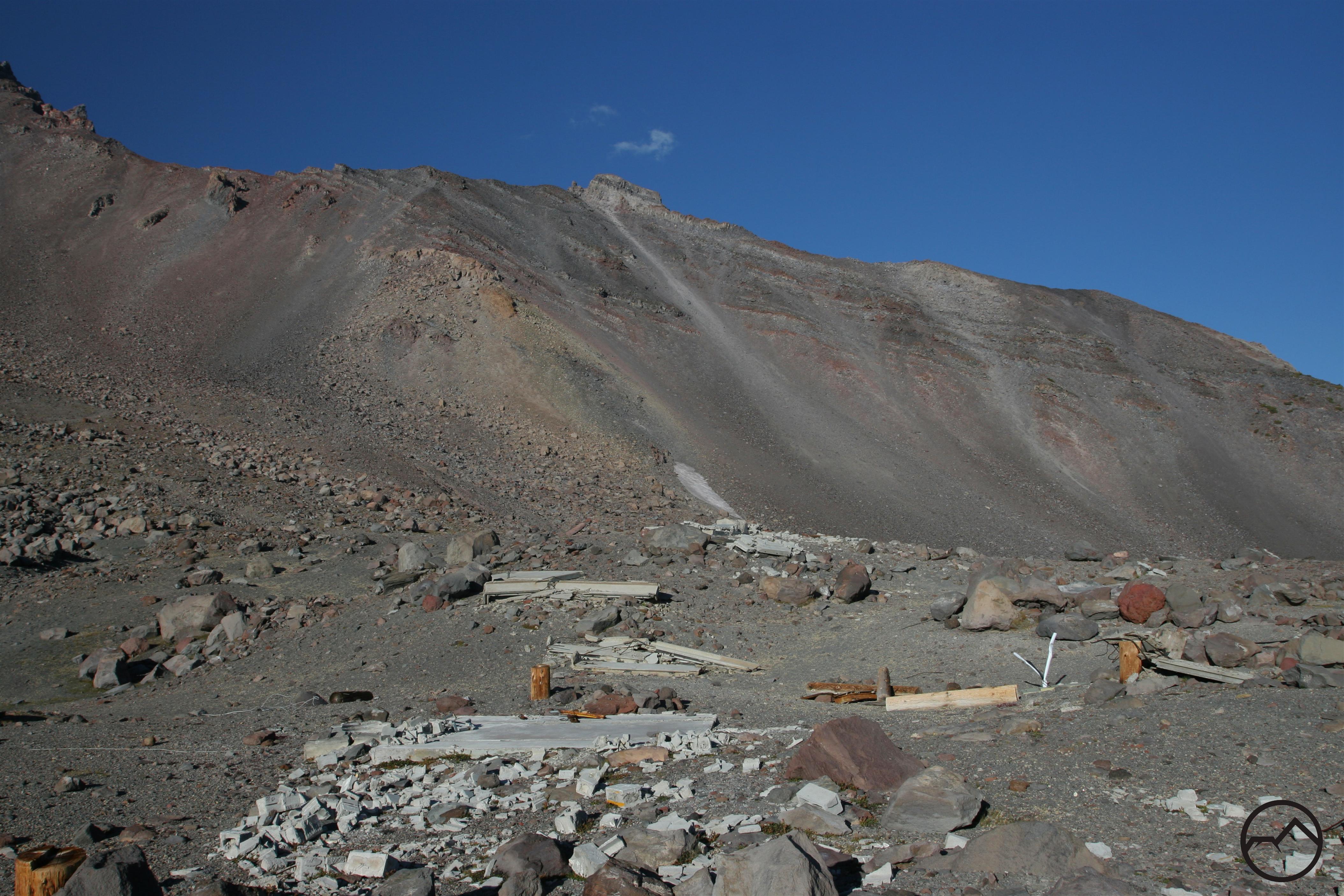 This is where one really gets a sense of what used to be here. Although the skiing outfit is now a mess of concrete, wooden beams, steel cable and rebar, it is obvious that a substantial structure once occupied this spot. This was the terminal of the chairlift that used to ferry skiers to the top of the run and begin the 1,400 foot descent down to the base of the slopes. With Green Butte nearby and Casaval Ridge, Thumb Rock and Shastarama Point all looming overhead, it was obviously a spectacular setting for a ski park. Still, the accouterments that accompany such an operation would have scarred the landscape and when one has hiked up here, it may be cause for appreciation that the current Mount Shasta Ski Park is located lower on the mountain. Interestingly, a small cluster of krummholz whitebark pine clings to the rim of the plateau, also marking the highest trees in the Old Ski Bowl. To reach Green Butte Ridge, the best place to divert off the main trail is right on the backside of the ruins of the chairlift. Here one must work over to the base of the ridge and again scramble up the steep talus. An obvious low notch on the ridge should be the destination. The main trail continues beyond this point for another 0.25 miles, passing the remains of an old radio tower. This is the end of the old roadbed the trail has been following from the outset. Beyond this point a use trail climbs up into the vast talus slope below Thumb Rock.