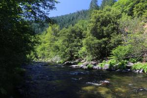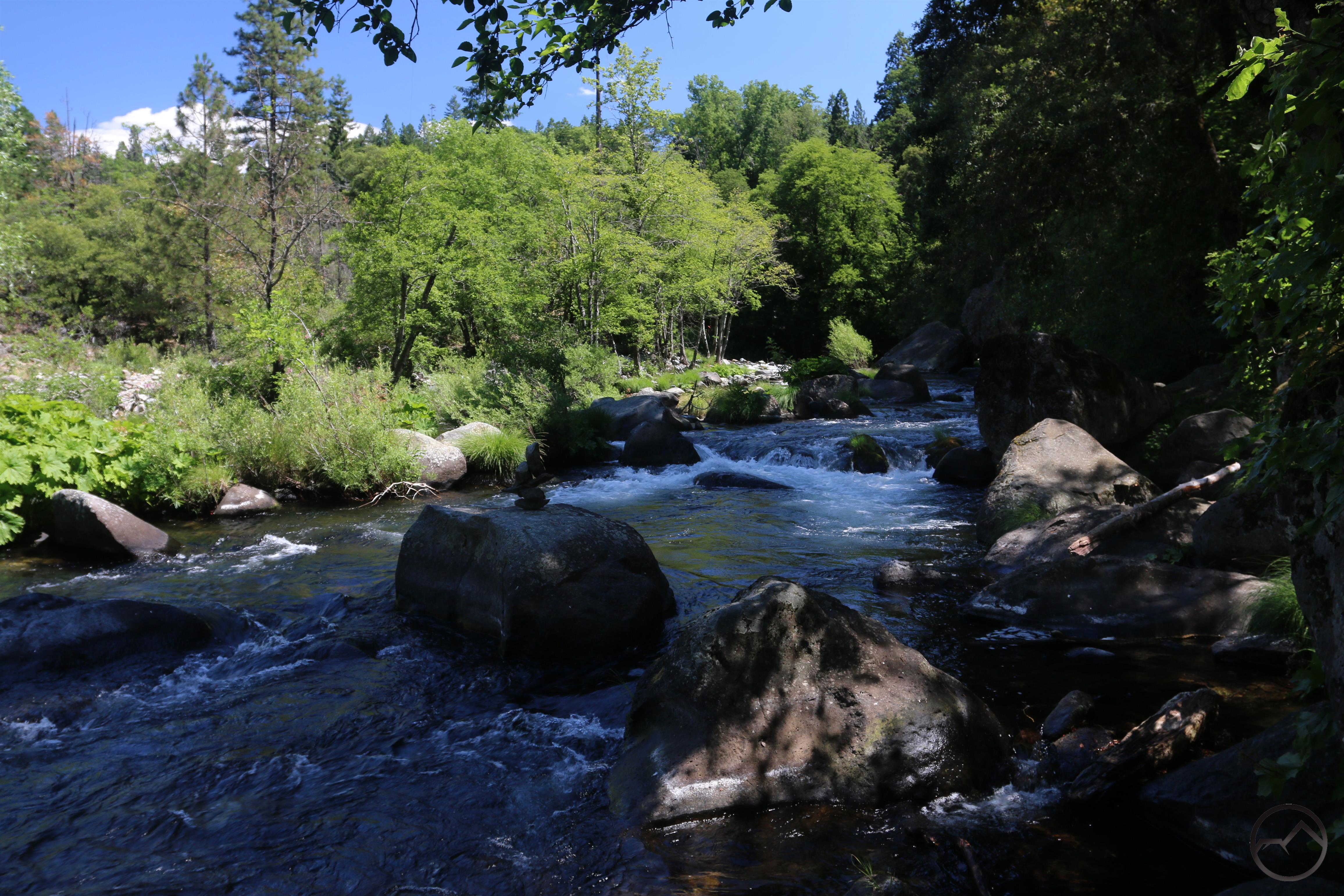 For those who want to hike a bit further, stay alongside the river and follow the trail until it comes level with the road. Continue to parallel both road and river past a couple of isolated picnic tables. From there a trail is visible beyond a curve in the road, passing through the garden’s slash heaps. This level path continues for a relatively short distance until it comes to an end at the edge of a collection of extremely large boulders. Here there is good river access once again, beautiful views upstream and even a subtle glimpse of Mount Shasta. This makes a great place to enjoy the river, the views and beauty of the entire area before turning around and retracing the trail back to Tauhindauli Park.