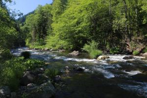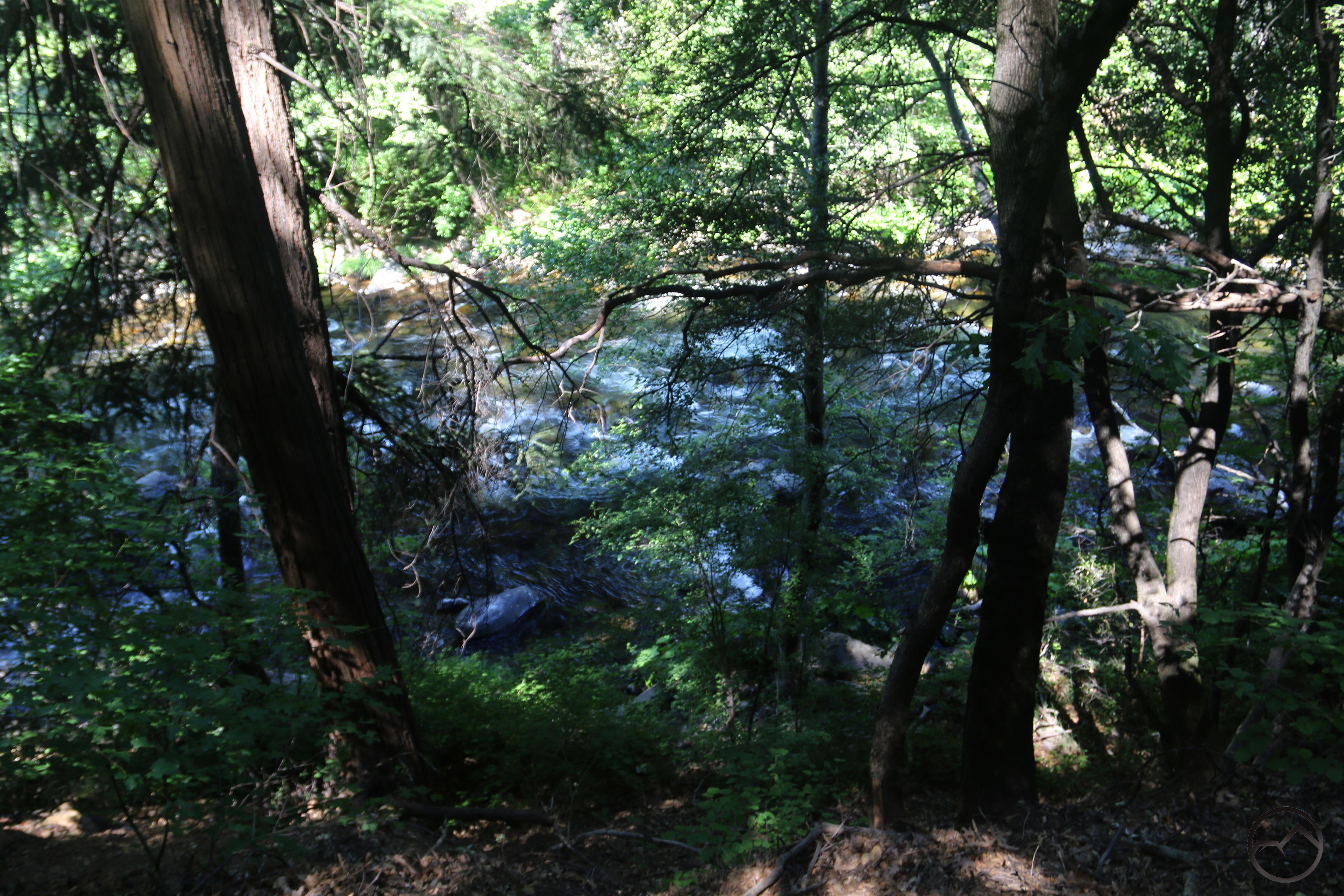 As the path descends, it goes beneath a canopy of vegetation so dense it resembles a small tunnel. The trail finally levels off right along the swift-flowing river. Continuing upstream, numerous side trails lead a few feet away to access the river. Large rocks, wildflowers and lush grasses all line the water. Though the railroad tracks lie just across the river they are largely undetectable unless a train is passing by. This means that this section of river appears to be essentially wild in character. Some moderate rapids add interest to the area as well. Maintain course alongside the river for a short distance before arriving at a small amphitheater. Here the trail splits. Stay left to continue along the river.