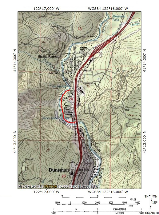 Driving north from downtown Dunsmuir, cross over the Sacremento River and turn left onto Pioneer Way. When it dead ends, turn left onto Masson Avenue then veer right onto Upper Soda Road. Follow this to the signed trailhead parking area.