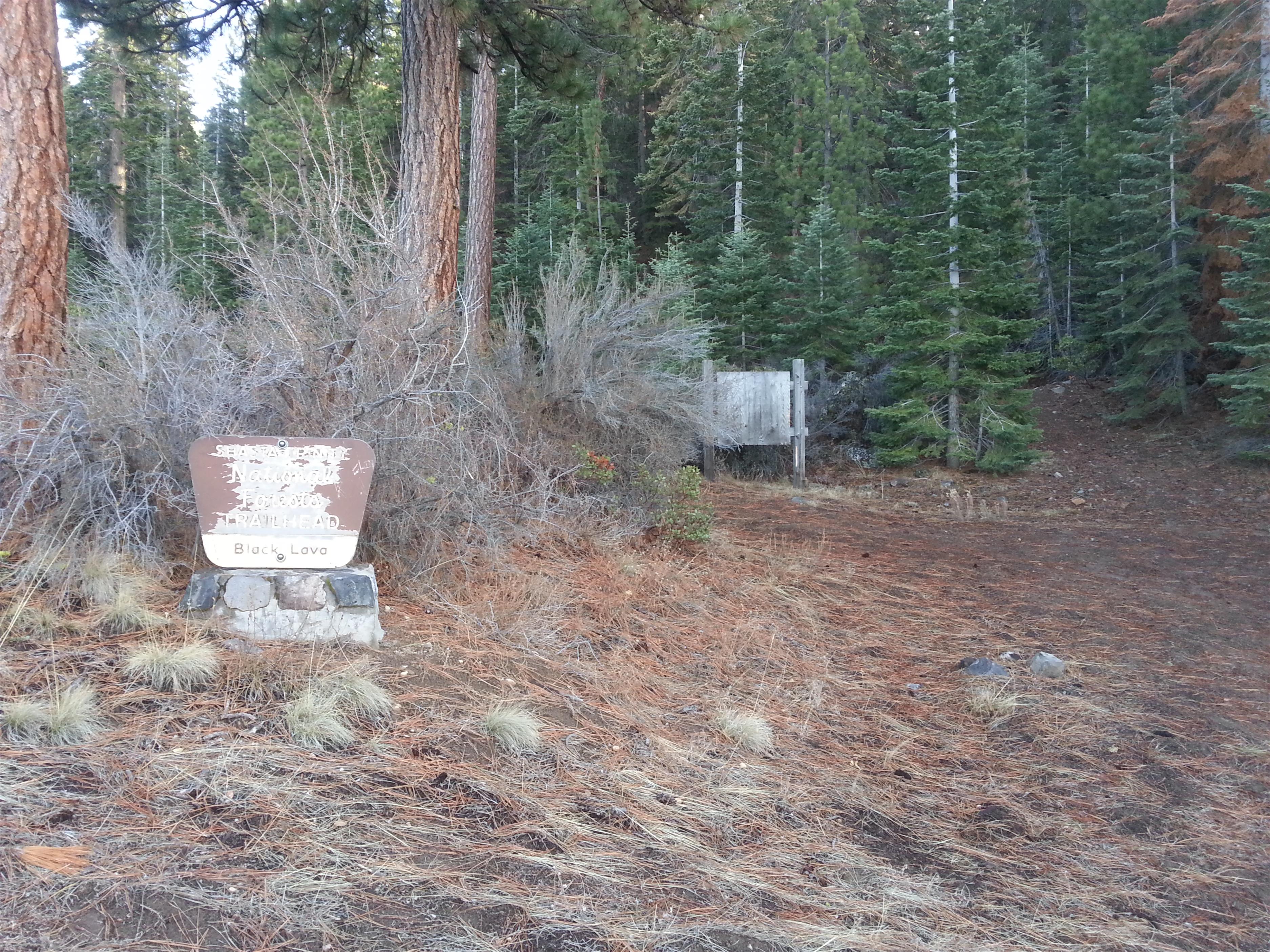 Even though the Black Lava Trail is all but forsaken, the trailhead is still marked by the usual Forest Service accouterments. A carved wood sign identifies the trailhead and a large board that was once covered with notes and information on the trail are both present. Be sure to walk a few dozen yards back down the road to enjoy great views of the Shasta Valley and Mount Shasta. To begin the trail, hike over the large earthen hump at the end of the south end of the parking area. This mound was built to block motorized vehicles from using the trail. While this may work for jeeps and such, it has not blocked the occasional ATV, the signs of which can be seen at times on the trail. Such use should not deter hikers from using the trail. It is only an indication of how little use the trail actually gets. Beyond the mound, the trail ascends moderately up the flanks of forested lava flow. Black basalt rocks are obvious along the entire length of the climb. After a couple hundred yards of climbing the trail levels off. This marks the unsigned passage into the Mount Shasta Wilderness. From here the trail continues to the southeast. Note the large ponderosa pines and the large basalt boulders. The trail passes occasional, small lava fields. The encroaching forest has not yet managed to take root in these small collections of dark rocks.