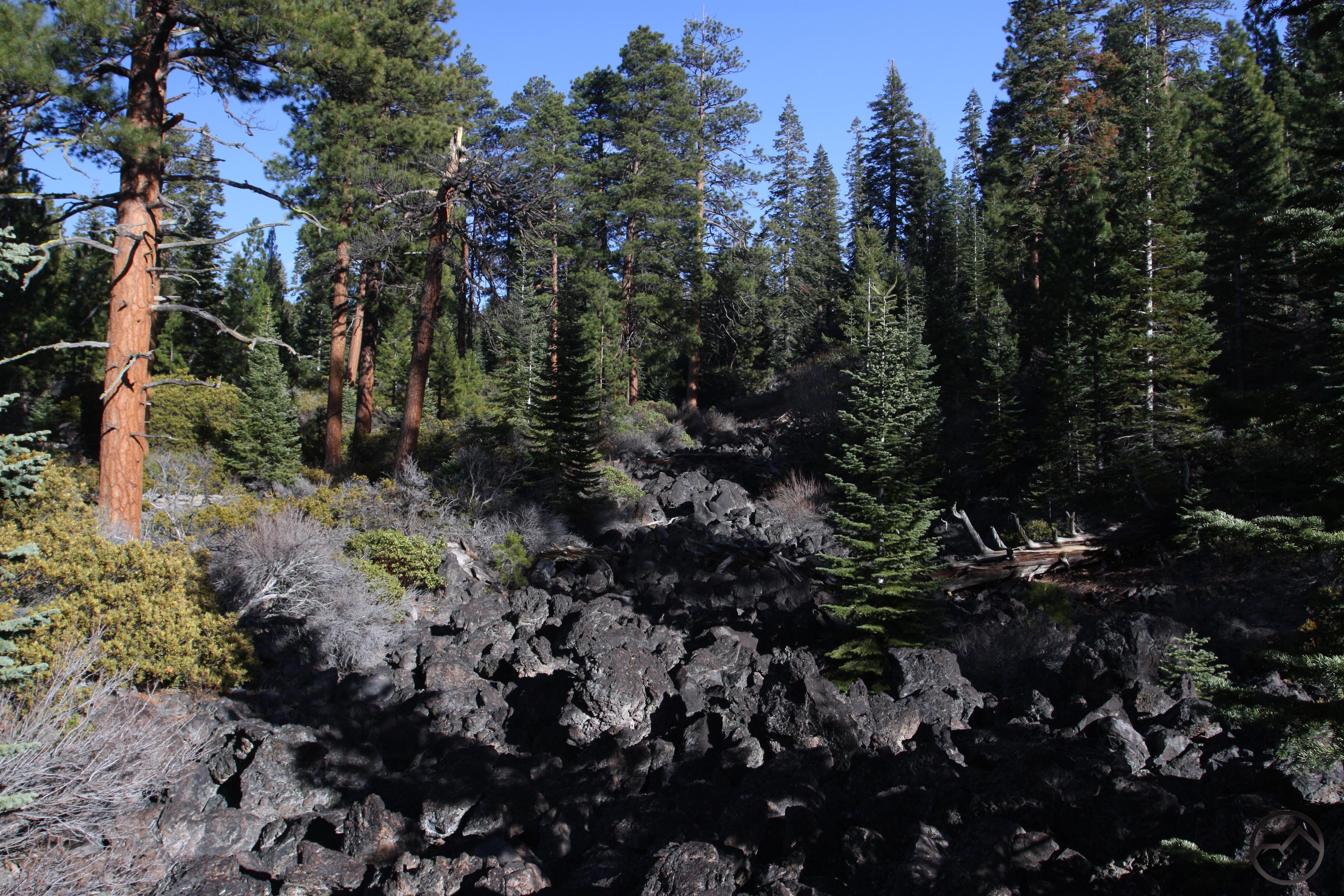 A short, obscure trail through an old growth forest at the foot of Mount Shasta. The path encounters numerous areas of black, exposed lava rock, remains of an ancient lava flow.