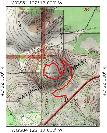From downtown Weed, drive east on Highway 97 for 10.5 miles. A small dirt road blocked by a green gate will be on the left. Park next to the gate. 9.5 miles from Weed, Highway 97 crosses over usually dry Whitney Creek. Visible ahead is the Haystack with Yellow Butte beyond. The dirt road is 0.5 miles beyond Whitney Creek. Be sure to close the gate at the beginning and end of the hike to the Haystack.