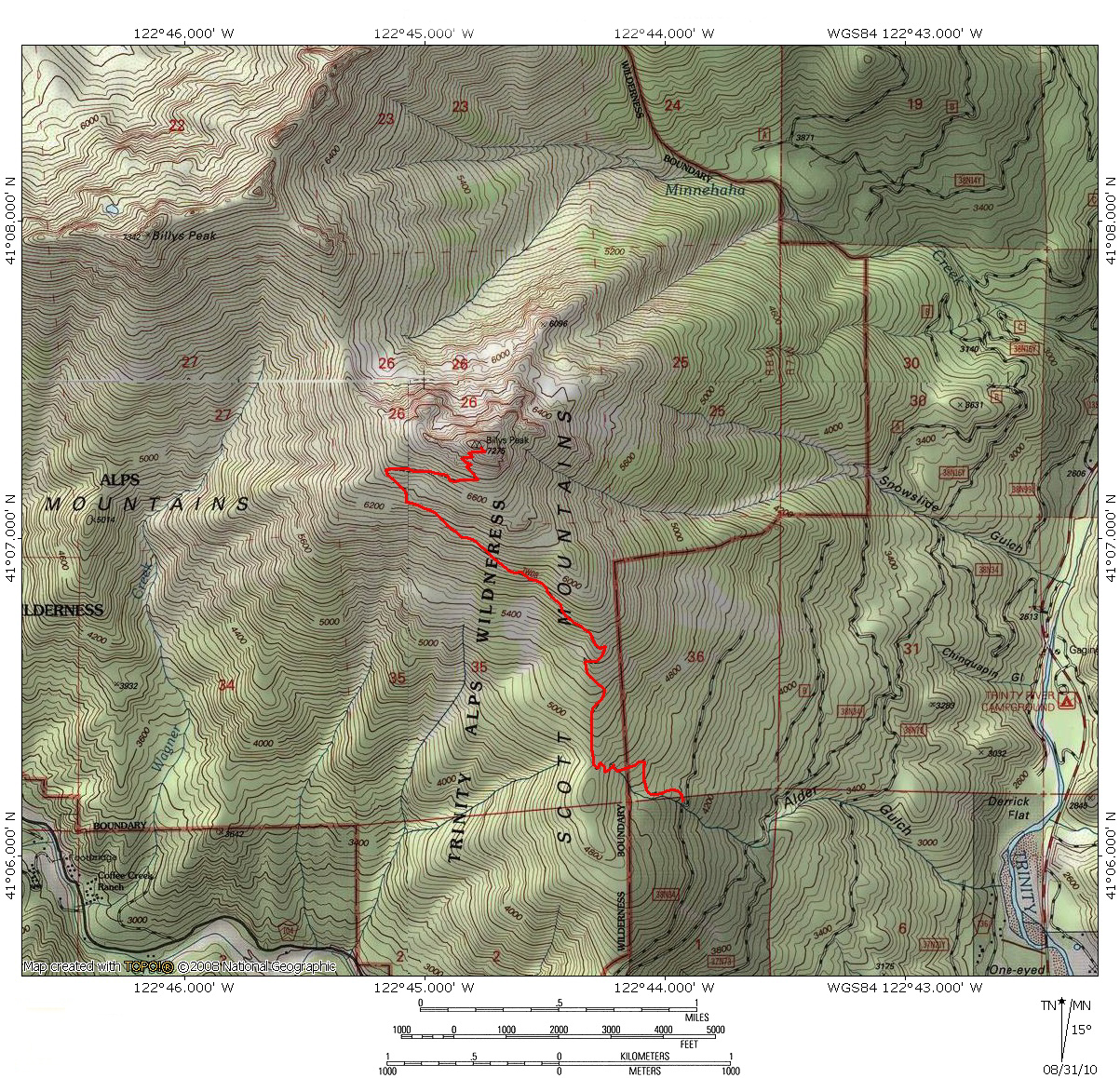 Billys Peak Lookout is a massive granite pyramid, one of the easternmost outliers of the Trinity Alps. Only the craggy, unnamed peaks surrounding Big Bear Lake are further east. Consequently, the peak is one of the most easily viewed summits of the Trinities, prominently visible from Highway 3 in the Trinity River Canyon and from numerous locations throughout the Trinity Divide. However, ease of viewing and proximity to a highway does not translate into frequent ascents of the mountain. On the contrary, Billys Peak Lookout is seldom visited. Adding insult to injury, it is also one of only two peaks in the high, eastern part of the Trinity Alps that has a maintained trail to its summit. In spite of this, the peak sees only a handful of people each year. The Lookout is one of a pair of peaks, along with Billys Peak proper, that makes up the larger Billys Peak Massif. This area is surrounded on all four sides by major creeks and rivers, thus separating it from the rest of the Trinity Alps. On its east side is the Trinity River. To the north is Eagle Creek. The East Fork of Coffee Creek marks its west perimeter and the main channel of Coffee Creek demarcates the southern edge of the massif. The only peaks in near proximity to the Billys Peak Massif are immediately to the north. These are the granite peaks of the Bear Lake area and the red crest of the Scott Mountains (the western portion of which fall within the Trinity Alps Wilderness).