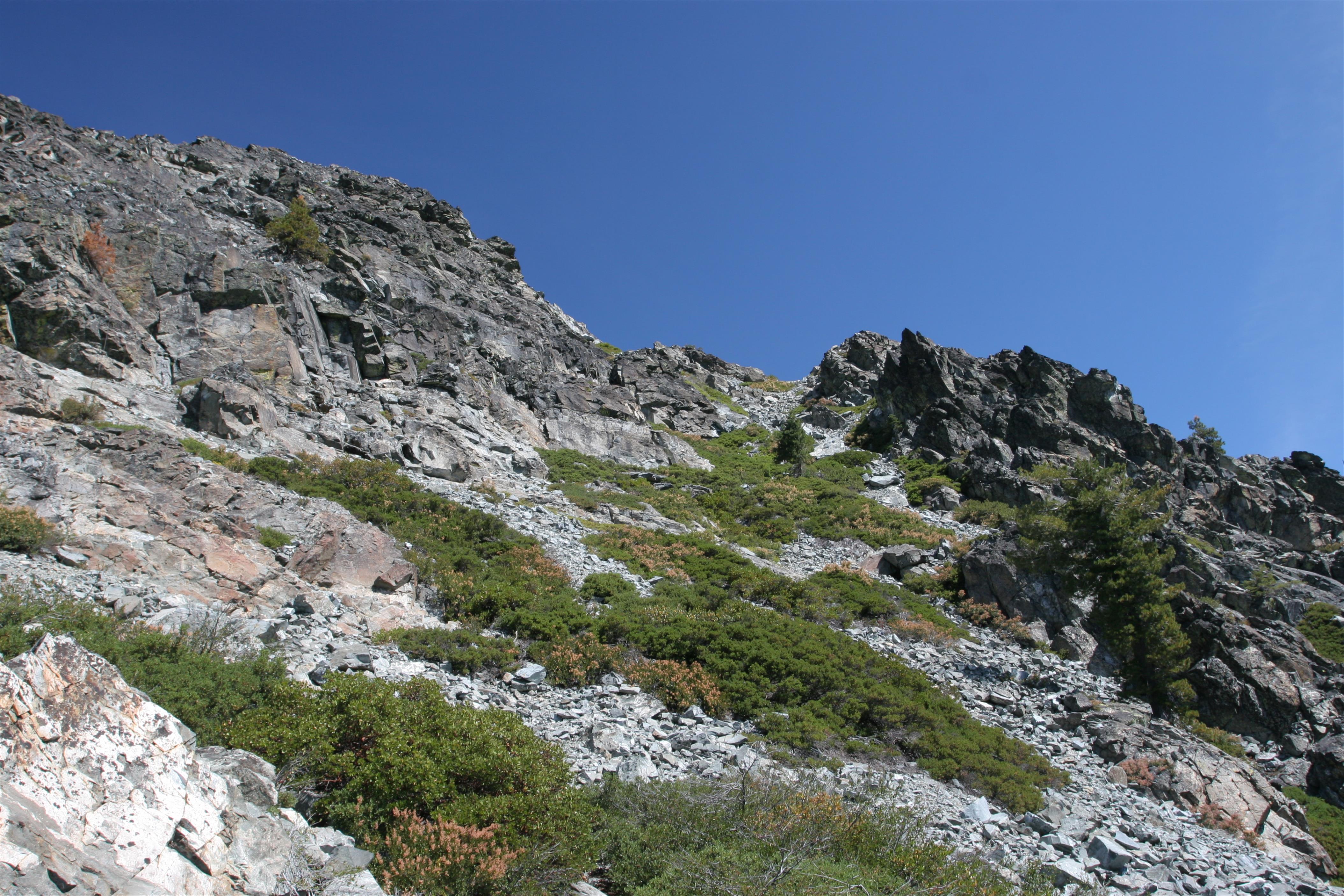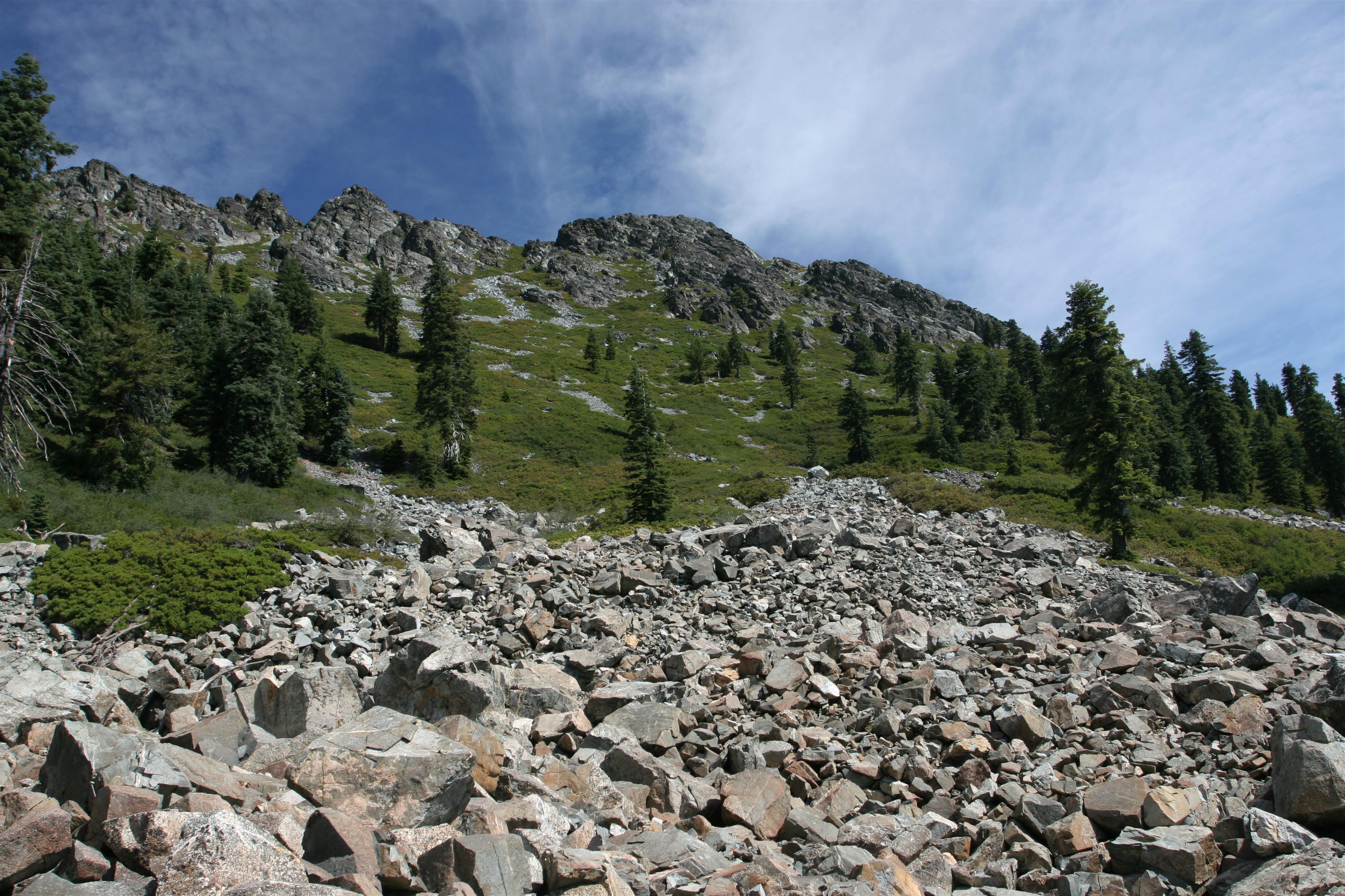 Ironically, the Billys Peak Trail does not climb Billys Peak. Instead, it surmounts the large granite pinnacle known as Billys Peak Lookout. The Lookout is separated from the Billys Peak by a saddle that dips over 1,000 feet below the two summits. The trail was originally built to provide access to the Forest Service lookout that once stood on the summit. Though gone, the lookout still provides the name to the otherwise nameless peak. The trail climbs steeply up the southern flank of Billys Peak Lookout, gaining just under 3,000 feet in 3 miles. Adding to the difficulty of the grade, the trail has not been maintained in quite a while and though the route is obvious, it is severely overgrown. This is particularly true in the higher portions of the trail where the route is almost entirely obscured. Only the rocky construction of the route gives indication of where to go in these sections. Further evidence of the lack of maintenance is the nearly 4 dozen snags that have fallen over the trail in the first mile. Despite these obstacles, the Billys Peak Trail is an excellent option for those who want climb directly into the Trinity Alps high country from right off of a highway.
