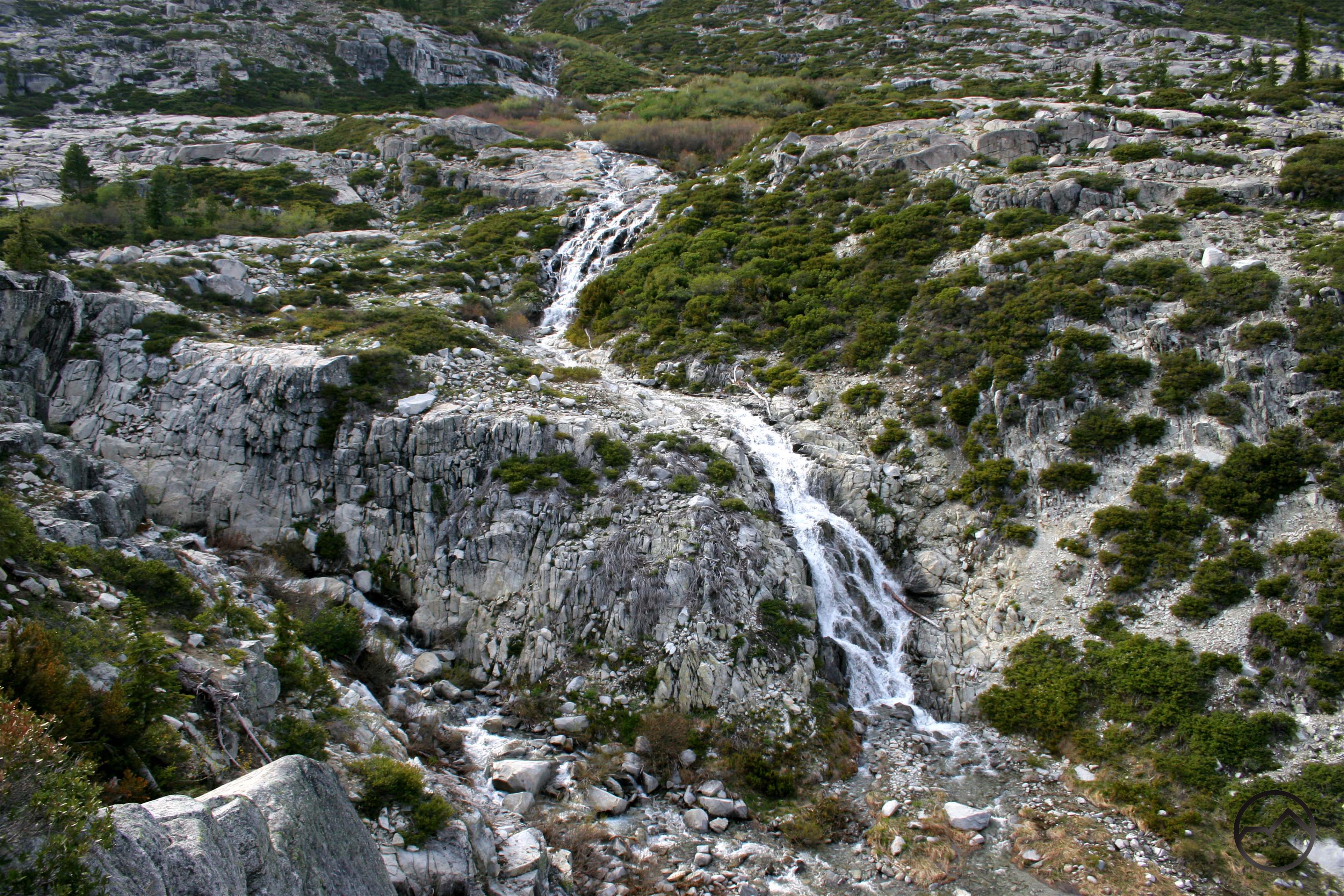 The Boulder Creek Lakes area contains two spectacular glacial cirques. Each cirque contains a primary lake and a few smaller satellite lakes. The larger of the two basins holds the Boulder Creek Lakes. Slightly higher and hidden in an exceedingly narrow cirque are the diminutive but gorgeous Forbidden Lakes. In addition to the lakes, there are an astounding number of waterfalls in the Boulder Creek Lakes area. Cascades seem to crash down every possible cliff face. During high water, Boulder Creek Lake has two outlets. The high water outlet is a beautiful, 50 ft. cascade flowing out of the north side of the lake. The primary outlet is a narrow granite trough the flows east from the lake for a few hundred yards before plunge off of the granite bench that holds the lakes in an excellent 300 foot freefall.