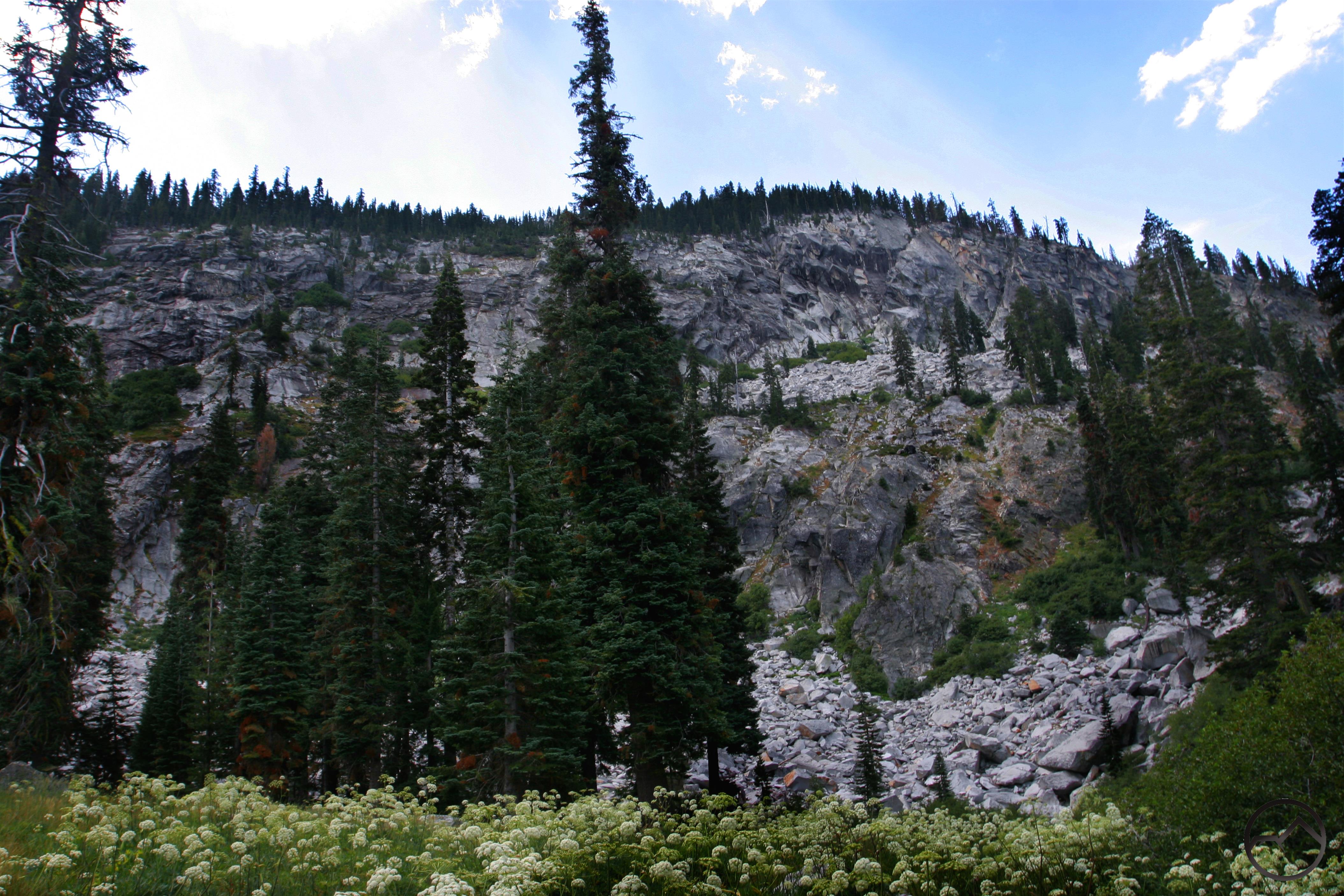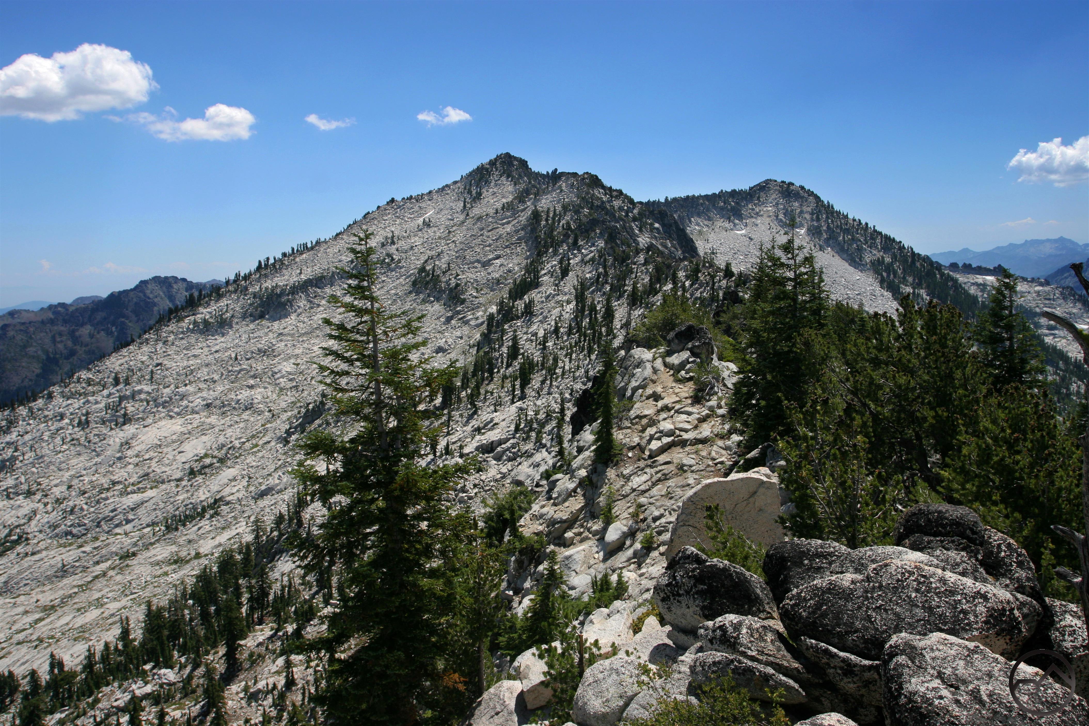 The New Caribou Trail begins at the Big Flat trailhead, on the east side of the Salmon River. The elevation at the trailhead is 5,041. The trail immediately drops down to the river, which must be forded. Once across the river, the trail splits. The Old Trail heads downstream to the right. Continue straight on the New Trail, up the west bank of the river. From here the trail begins to switchback at a moderate grade up the side of Caribou Mountain. After 0.5 miles, the trail begins a long southward traverse, extending for a mile before switchbacking to the north. Views to the southeast are good. Preacher Peak, Black Mountain and Red Rock Mountain are all visible on the east side of the Salmon River Canyon. Another 0.5 miles later, the trail switchbacks again to the south. After climbing a final 0.6 miles, the route finally reaches a saddle at 6,300 feet. Here, at Caribou Meadows, the New Trail intersects the Old Trail, which is completing its long descent of one of Caribou Mountain’s massive ribs. From here the Old Trail begins its trek down Caribou Gulch to the Salmon River. More on this will be discussed later. Caribou Meadows is a nice grassy spot, but is not much compared to impending Brown’s Meadows or the lush terrain on the east side of Caribou Lake. From Caribou Meadow, the New Trail begins a long traverse to the west, toward Point 6,708. The route is carved right into the granite cliff, the first such encounter with this rock type thus far. Point 6,708 and the area below it burned in 2008 and a ghost forest of snags presents an eerie sight as one rounds the small peak. Once around Point 6,708, the New Trail passes into Browns Meadow, the only reliable source of water on the trail. The meadow runs up against sheer granite walls to the south. The grassy area yields a fine creek that is choked with alder trees. The point where the trail crosses the creek is the best place to get water. If one intends to camp before reaching the lakes, this is the only realistic option.