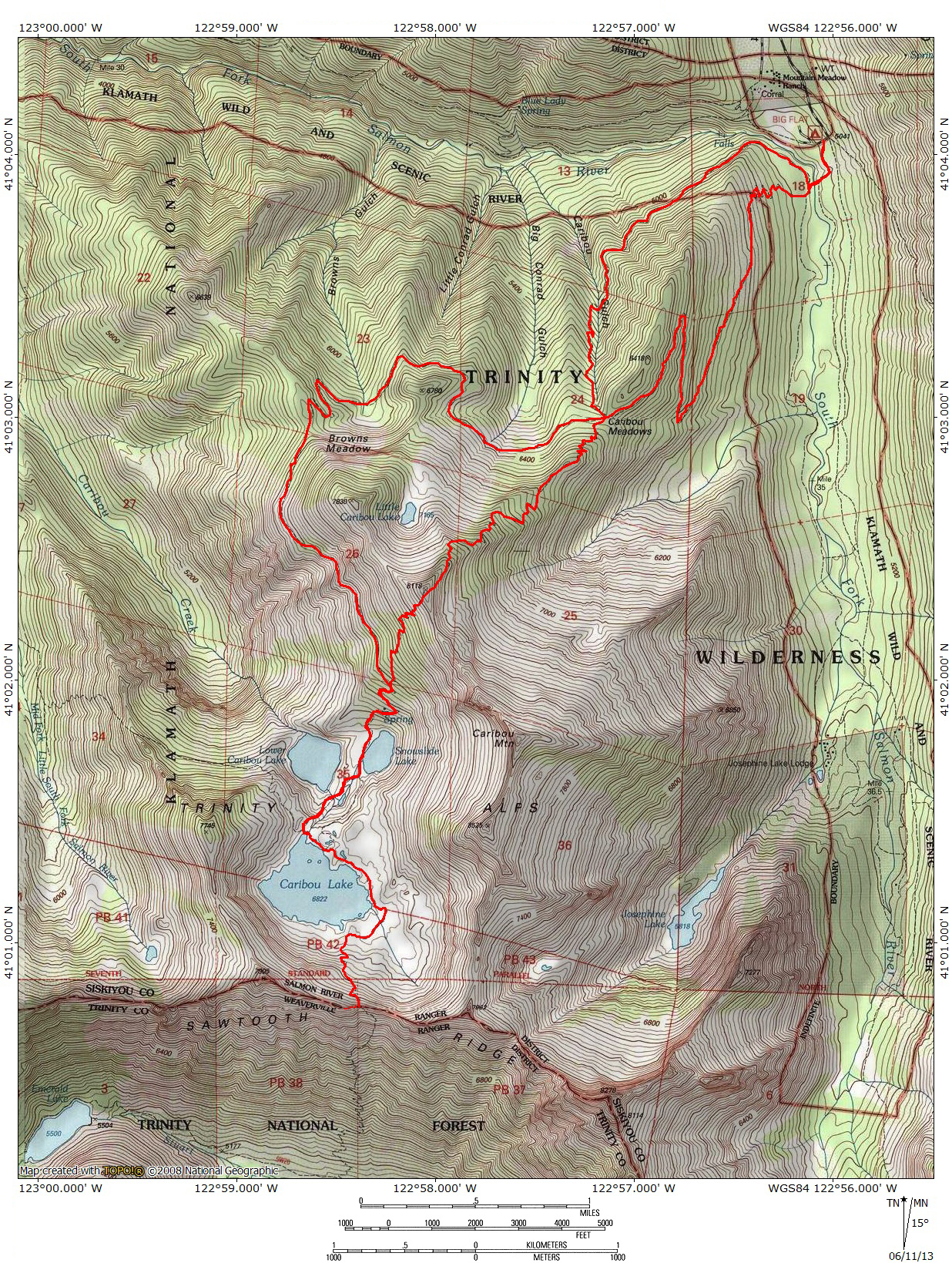 The trip to the Caribou Lakes is one of the classic backpacking trips in the Trinity Alps. In addition to visiting Caribou Basin, the trek also offers a stop at Little Caribou Lake and a chance to climb to the top of Caribou Mountain itself. Two trails, the Old and New Caribou Trails actually lead to Caribou Basin. The Old Trail is routed along the Salmon River and then climbs straight up and over Caribou Mountain, topping at 8,118 feet, only 450 feet below the summit. From this point it descends 1,200 feet down into the basin. The New Caribou Trail was constructed in the 1950’s and is routed around the side of Caribou Mountain, resulting in a much more reasonable grade. While it is possible to climb up the Old Trail to the top of Caribou Mountain as a day trip, it is a much more pleasurable experience to take the New Trail to Caribou Basin and camp at one of the lakes. From there, one can make a much easier (1,600 fewer feet to climb) day trip up to the summit or one can take the Old Trail back to the trailhead, thus completing a great figure-eight and climbing the peak as a short side-trip. If one has the time, this is the preferred option and this page will follow this course.
