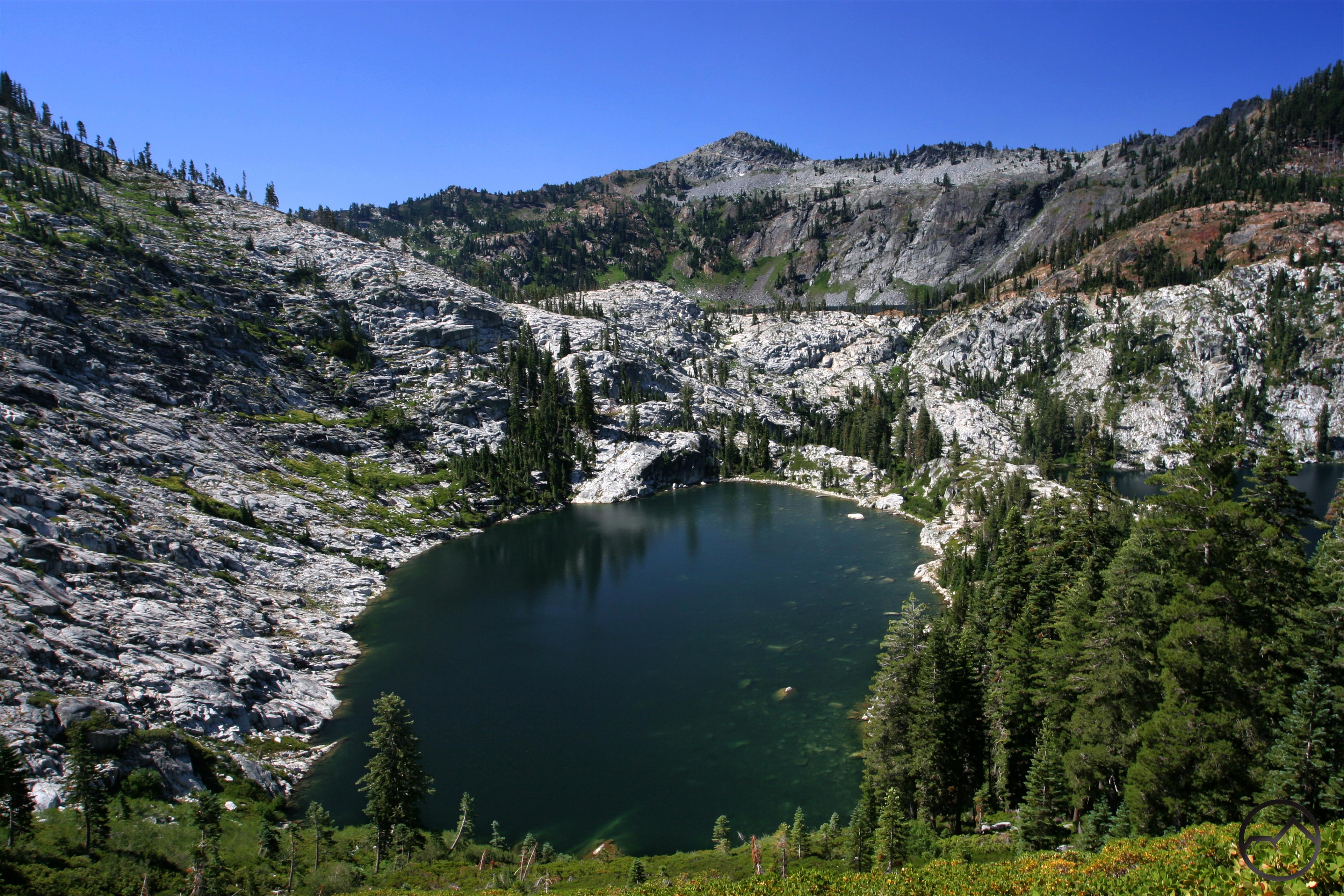 From Snowslide Lake, the trail crosses the granite dike and then climbs up to a ledge on the south side of the lake. The route arcs along the ledge, through small, lush meadows and bright, white granite. After passing several small tarns, the trail finally reaches astounding Caribou Lake. At 72 acres, it is the superlative lake in Northern California. Sheer walls climb high above the lake on three sides. To the north, Lower Caribou Lake is visible, with the northern Trinity Alps and Marble Mountains discernible in the distance. There are great campsites throughout the area. Most folks tend to camp along the bench on the north side of Caribou Lake. The best of these is near the outlet. There are a few islands in the lake that make great places to swim out to. The east side of the lake has small, delicate meadows interspersed with a large granite area. Try to avoid camping here if possible. There are also a few spots on the south side of the lake, near the headwall. There are few good spots around Snowslide Lake but the bench next to Middle Caribou and Lower Caribou Lakes has some great spots. One in particular is near the cascade that tumbles down from the main lake into Middle Caribou and the outlet as it flows over smooth granite down to Lower Caribou.