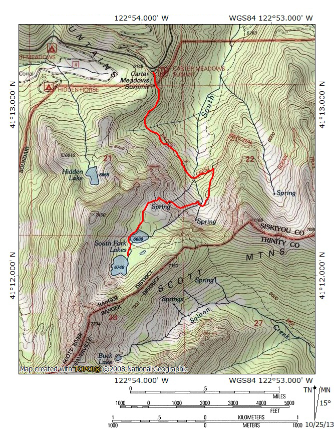 The South Fork Lakes Trail begins at the PCT trailhead at Carter Meadows Summit. This trailhead is without doubt the easiest Trinity Alps trailhead to reach. Only about 30 yards of paved driveway separate the parking area from the Cecilville-Callahan Road. Interestingly, there is also a pave helipad at the compact trailhead as well. The path immediately descends steeply to a four-way junction only a few yards from the beginning of the trail. To the far right the PCT continues north toward the Russian Wilderness, which lies just north of Carter Meadow Summit. Moving to the left, the next trail leads down to Carter Meadows and the Hidden Horse Campground. Continuing left, the next trail is the short and stupendous Hidden Lake Trail, the easiest trail in all of the Trinity Alps, though it does not lack great scenery despite its short duration. Finally, the last trail at the junction is the PCT, heading to the south. Take this trail and begin to descend gradually. The trail crosses the boundary into the Trinity Alps immediately. Though the road is only a short distance away, its influence, including the sound of occasional cars is quickly forgotten. As the trail heads south the views of the South Fork of the Scott River’s headwaters basin improve. Most notable is a tall, craggy peak looming over a deep basin. The trail passes through beautiful forests along this section of trail, punctuated at times by small boulder fields and rocky benches. The views come and go as the trail begins to arc to the west. A small stream is crossed at 0.45 miles. Another 0.4 miles further leads to a series of crossings, the largest of which is the Scott River’s South Fork, newly emerged from its headwaters. The PCT continues another 0.15 miles beyond the crossing to the junction with the South Fork Lakes Trail. The trail actually starts over a mile away down in the basin but taking the PCT is more scenic and makes climbing the 700 feet up to the junction unnecessary.