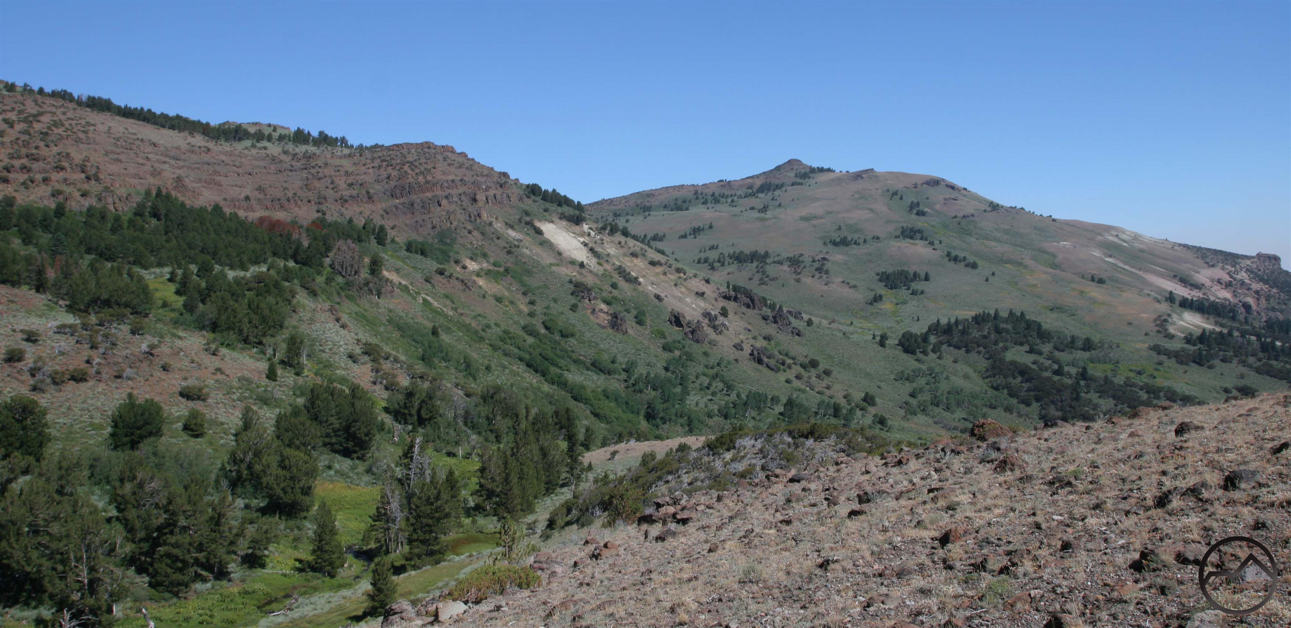Once on the Squaw Peak Trail proper, the path drops below the crest of the Warner Mountains as it continues south. After passing some springs and an increasingly deep canyon, the trail briefly enters a thick group of pine and aspen. On the far side of the small wood, the trail again enters open terrain. Below the route is a broad flat bench occupied by a very large meadow. The meadow is the source of Milk Creek, which cascades down into the Surprise Valley far below. The summit of Squaw Peak is visible high above. The route rounds the southern fringe of the meadow before making a broad arc around the eastern flank of Squaw Peak. The terrain is grassy and the views are superb throughout. Once the trail has reached the south side of the mountain, it begins to drop quickly. After 0.5 miles, the path reaches a switchback, turning sharply to the east. As good as the views have been, they are now an order of magnitude greater. The cliffs of Warren Peak and “Cottonwood Butte”, with Cottonwood Creek cascade down them are staggering. Another 0.5 miles results in another switchback, the trail now heading west. Soon the route begins to drop at a faster rate, passing the intersection with the Owl Creek Trail as it makes the final descent into Cottonwood Meadow. The trail finally levels off as it reaches the bottom of the Cottonwood Basin.