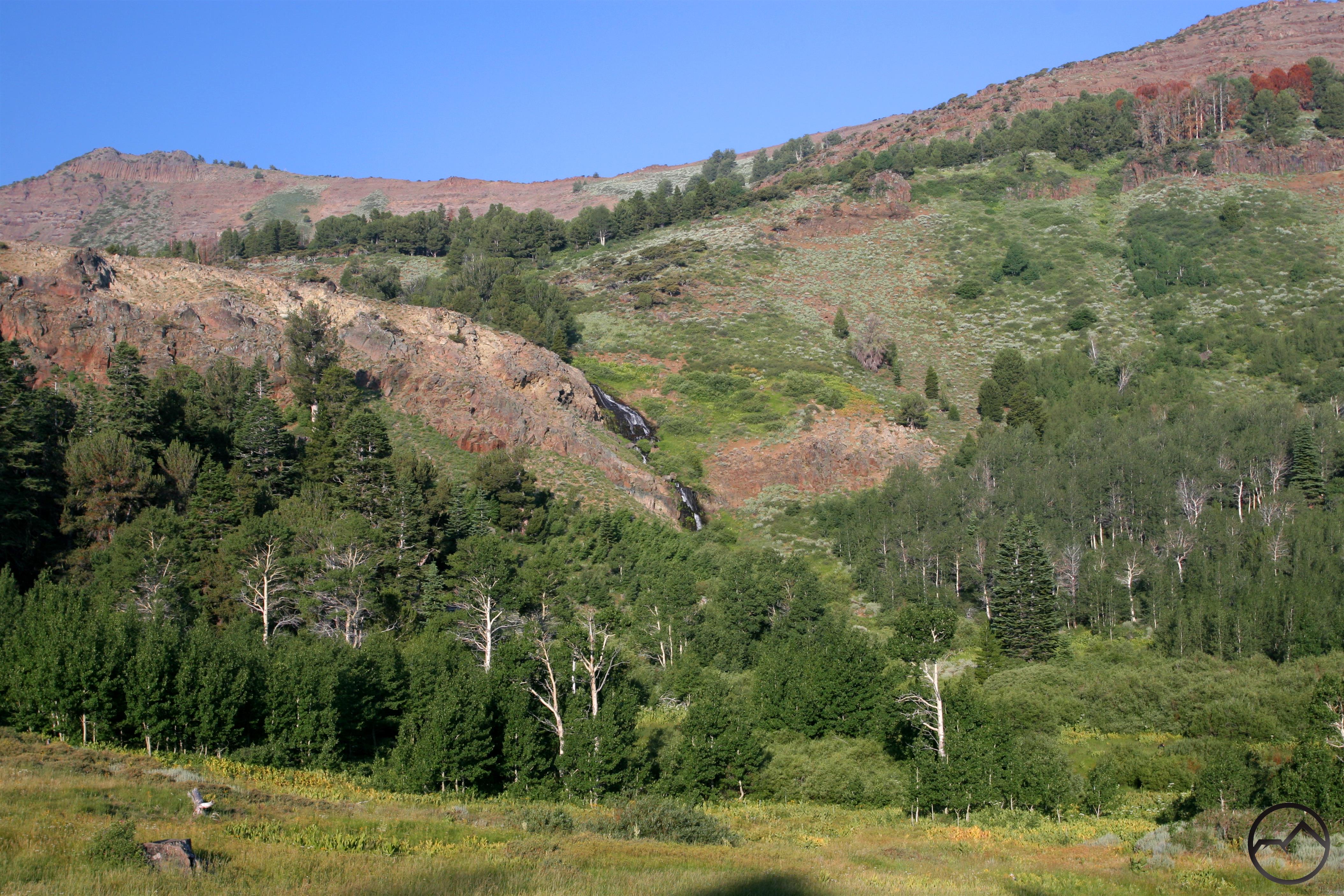 Cottonwood Meadow is nestled into the bottom of Cottonwood Basin. Lush, grassy meadows are interspersed with clumps of willows and other shrubs. Groves of aspens line the perimeter of the meadow and climb higher up the slopes above the bottom of the basin. Steep cliffs soar vertically above the west side of the basin, rising over 1,600 feet above the meadow. Initially the cliffs are covered with grass and sagebrush, broken up at times by dark rock outcroppings. Higher up, the vegetation gives way to the striated reddish rock along the rim of the escarpment, giving the area a classic Warner Mountains appearance. To the north, the great dome of Squaw Peak lines the horizon while to the south the giant block of “Cottonwood Butte” hems in the northern side of Cottonwood Basin. Through all of this flows tranquil Cottonwood Creek, which meanders through the meadow. The creeks entrance to the basin is not tranquil, however, as it flows over a 100 foot high, two-tiered waterfall. It is a gorgeous scene and one of the prettiest in all of the Warner Mountains. This is a fantastic place to set up camp.