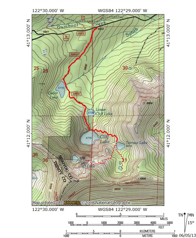 Cliff Lake is a sublime vision of alpine splendor. The lake is large and deep and it is surrounded by cliffs on three sides. The cliff at the south end of the cirque emerges directly from the lake’s blue waters and climbs 1,500 feet to the summit of Many Lakes Mountain. Numerous snow-fed cascades crash down the face of the cliff and two large streams, falling precipitously out of Upper Cliff and Terrace Lakes also contribute to the symphony of cataracts. The scene is reminiscent of that found at Castle Lake, though the setting at Cliff Lake is much more intimate because the cliffs press in closer around the lake. Looking about halfway up the cliff, it is possible to make out a broad bench. This bench is accessible from Terrace Lake. Just to its right there is a bowl nestled into the upper reaches of the rocky cliff. This is the uppermost cirque in Cedar Basin and is home to hard-to-reach Upper Cliff Lake. Be sure to remember that to the right of the road that leads to Cliff Lake is the private inholding. There are a couple of cabins and some outbuildings. Do not venture to this side of the lake. Instead, cross the lake’s outlet creek. There is a well-established use trail a few dozen feet south of the out. It is also possible to cross over the logs clogging the outlet.