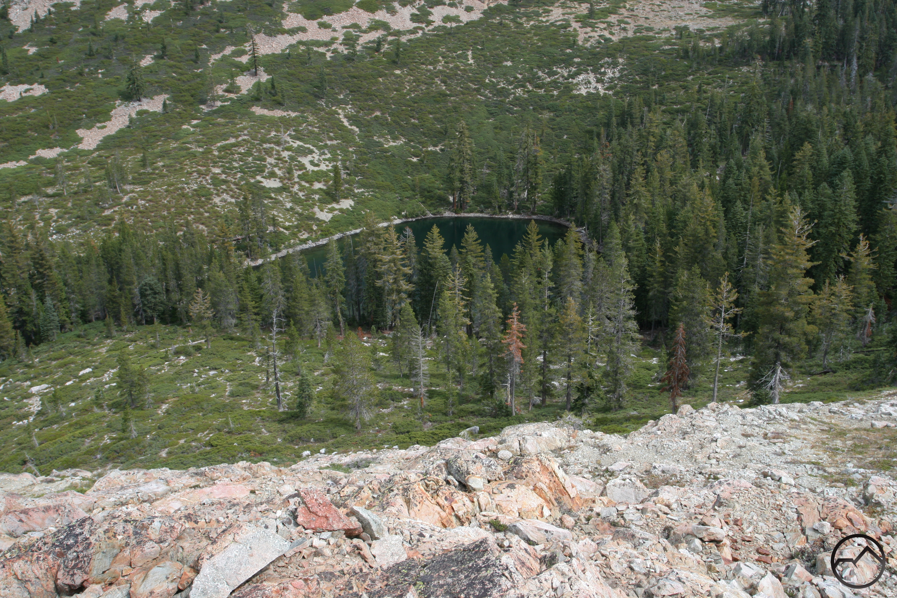 The parking area right off of South Fork Road is large enough to accommodate several cars though there it is rare for any vehicles to be there. Park in the large clearing and simply begin hiking down the road. It is very level as it passes through a mixed forest of cedar, ponderosa pine and various firs. Tough they are not quite as dense at the beginning of the trail as they are around the lakes, be on the lookout for Port Orford Cedars. These trees are technically cypress trees rather than cedars but the foliage does resemble that of a cedar. Some of the most distinguishing characteristics are the blue tint of the sprays and the blue and red cones that form on the spray’s tips. Continuing down the road, the grade is almost non-existent. There are a few creek crossings but none of the streams are large and will most likely be dry by mid to late summer. About 0.75 miles from the trailhead, the forest around the road opens up as Cedar Lake comes into view. This lake is the shallowest of all the lakes in Cedar Basin. There are some good campsites around the lake for those inclined to camp, though there are better sites ahead. The road skirts the northern end of the lake before coming to an impressively built rocky causeway. The outlet of Cedar Lake has created a very marshy area and in order to cross it the road has been built up by piling up large boulders. Driving over this section would not be fun but walking over it is easy.