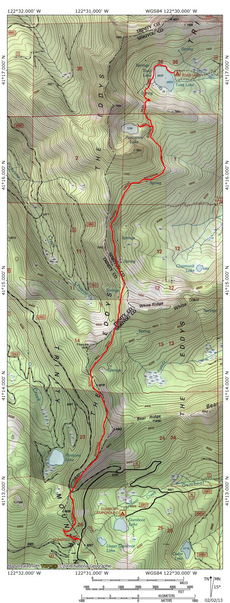 Porcupine Peak is reached by following the Pacific Crest Trail for 5.6 miles north from Gumboot Saddle, traversing the Eddy Range just below its crest nearly the entire distance. The route is easily graded and provides spectacular views nearly the entire distance. Among the highlights are the ever-present views of Mt. Shasta, the regions highest peak and one of the tallest and most massive mountains in the Lower 48. The trail crosses through open, rugged terrain for much of the trip, but it does pass through old growth forests and lush meadows as well. Once Porcupine Lake is reached via the PCT, it is necessary to scramble 0.5 miles to the summit. It is also possible to drive as far as Toad Lake, which is 0.4 miles from Porcupine Lake and 300 feet lower, but the drive is long and difficult, traveling over poor roads. It is easier to simply make the beautiful trip along the PCT and this is the preferred route to Porcupine Peak.