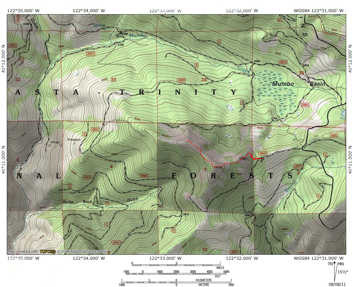 Though not on the trail, it is worth mentioning the nearby Mumbo Lakes. These lakes are easily accessed off of the paved Forest Service road the loops around the southern end of the Trinity Divide. Mumbo Lake is a large tree lined lake at the foot of Many Lakes Mountain and Tri-Counties Peak. The Pacific Crest Trail passes high above the lake. Though not significant trails pass by the lake, it is a great place for dispersed camping and there is plenty of opportunity for some cross-country exploration, especially to shallow Upper Mumbo Lake and some unnamed ponds and meadows. Interestingly, the lake is one of the few in the northern two-thirds of the Trinity Divide that lies on the west side of the crest. Only Picayune Lake the Deadfall Lakes share the western side of the range. Conversely, in the southern end of the range, the lakes are almost exclusively on the west side, Grey Rock Lake and some extremely remote tarns being the lone exceptions. If hiking the South Mumbo Scramble, Mumbo Lake is worth a stop.