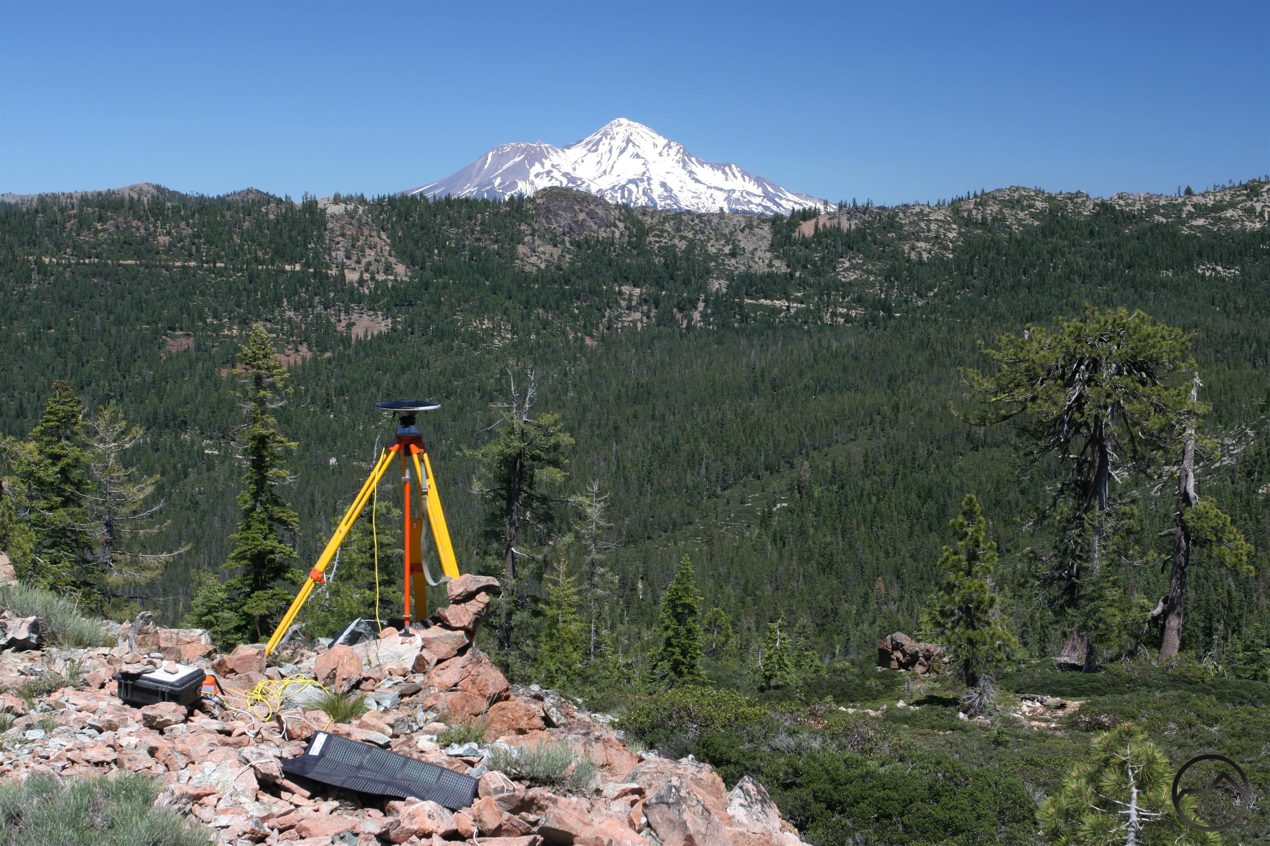 From the pullout on road 38N55, there is an obvious route up the side of the mountain. The route is not a maintained path but a very faint use trail. There is a fair amount of short, innocuous brush covering the ground through which the path is discernible. As one progresses, the path gets narrower and ultimately fades as it leaves the forest. From here, the slopes are generally naked rock with patches of low brush. It is easy to pick ones way through the brush to the rocky shoulder of South Mumbo Peak. This shoulder is used as the volcano observation point. The path to this point was probably established by those who placed a USGS volcano monitoring station at the east end of South Mumbo Mountain. The location is opportune, since Mount Shasta towers high above the Trinity Divide crest to the east. The monitoring station is not always present but if it is do not disturb it.